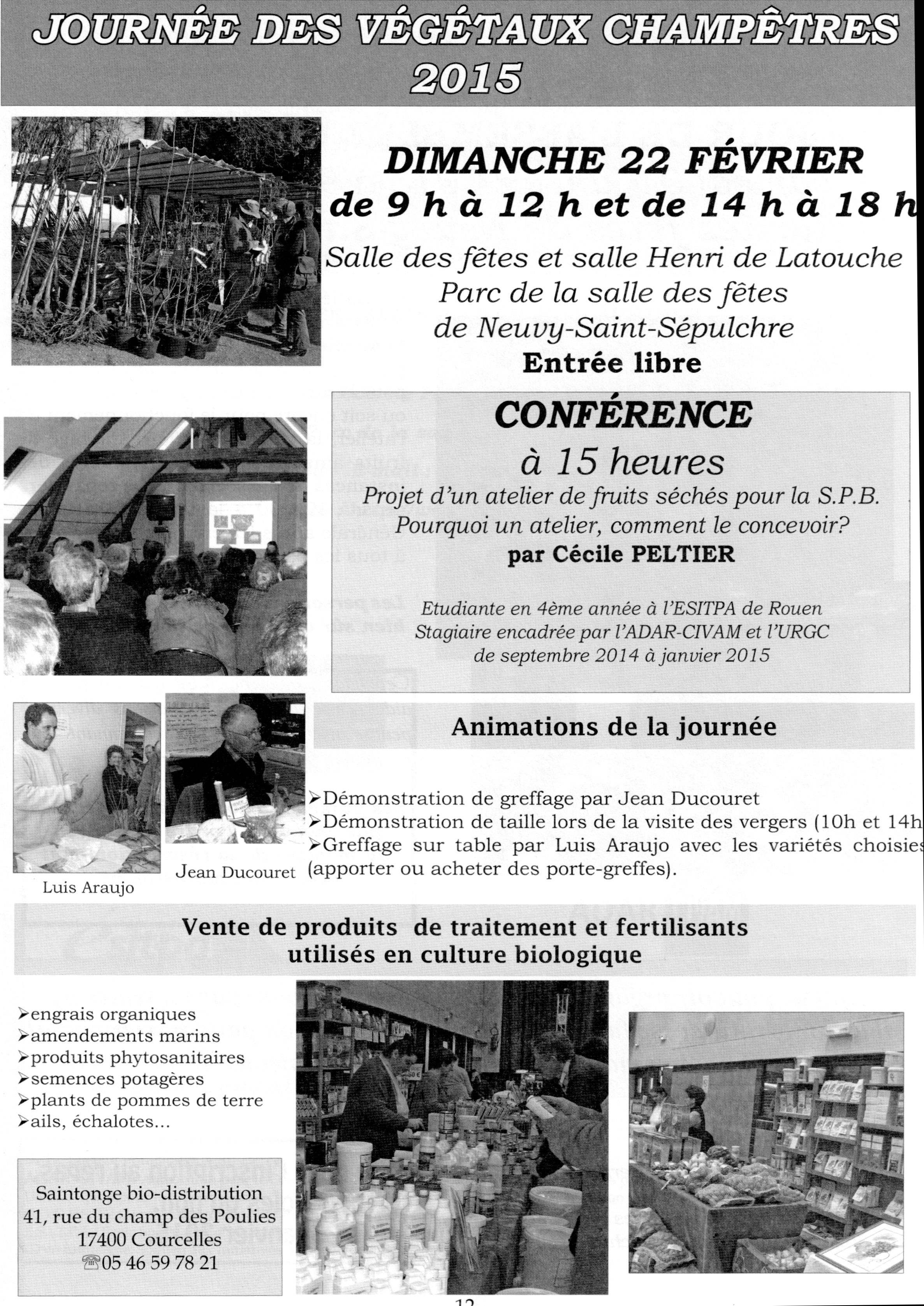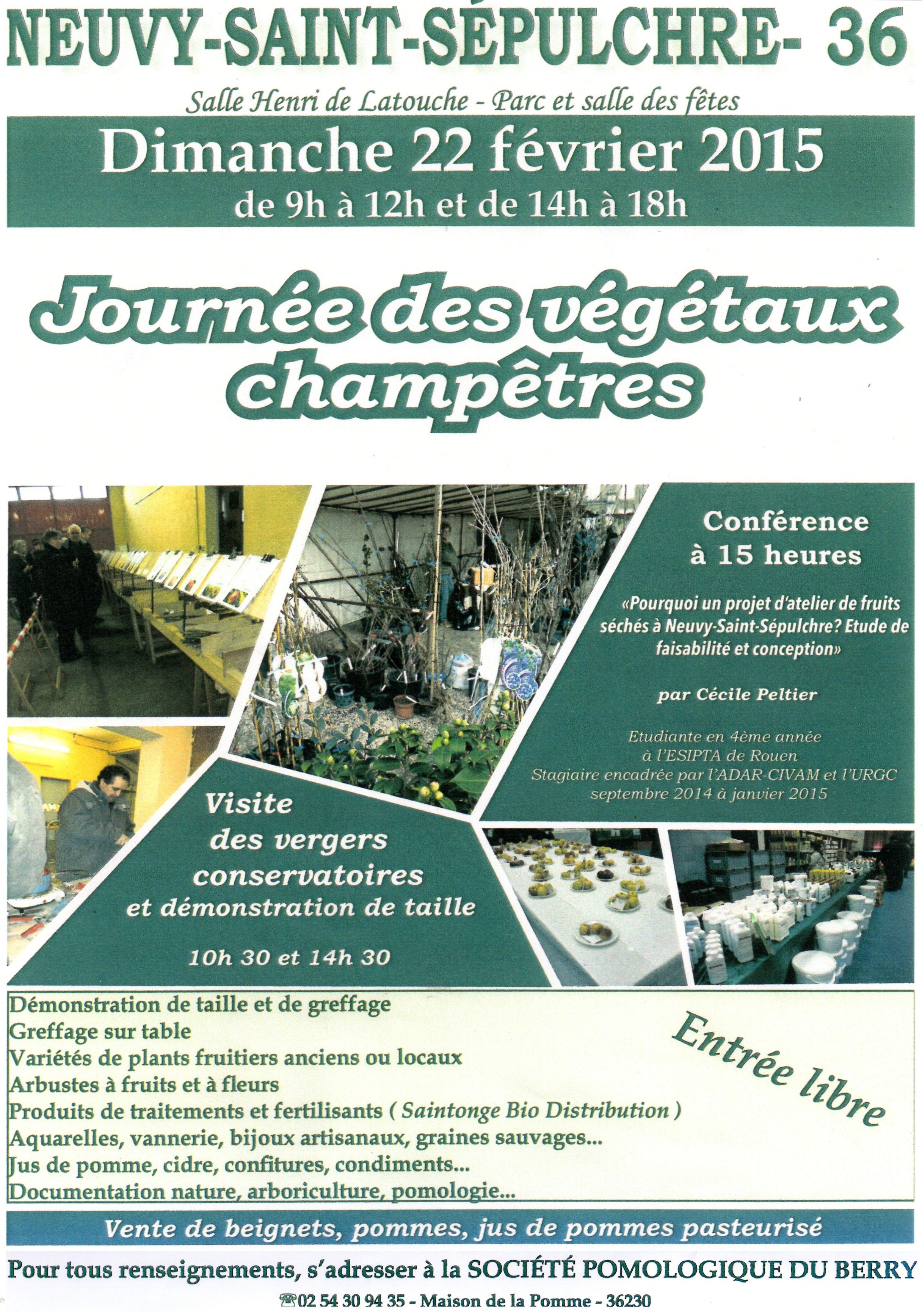 mi-avril. Journée des végétaux champêtres, aujourd'hui, de 9 h à 12 h et de 14 h à 18 h, au parc et à la salle des fêtes de Neuvy-Saint-Sépulchre. Entrée libre. Visite des vergers conservatoires et démonstration de taille à 10 h et à 14 h 30. J.-M.B. |